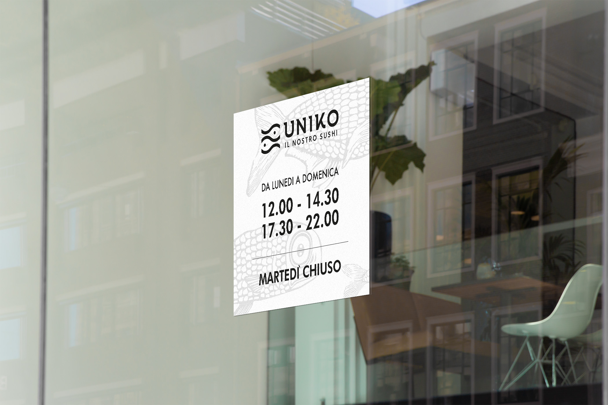 Design semplice ed elegante per comunicare gli orari di apertura di Uniko Sushi. La grafica combina elementi minimalisti e dettagli illustrativi per richiamare il mondo marino e rafforzare l'identità del brand. Il layout chiaro e ben organizzato garantisce massima leggibilità e coerenza con l'estetica del locale.