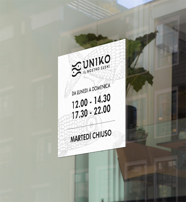 Design semplice ed elegante per comunicare gli orari di apertura di Uniko Sushi. La grafica combina elementi minimalisti e dettagli illustrativi per richiamare il mondo marino e rafforzare l'identità del brand. Il layout chiaro e ben organizzato garantisce massima leggibilità e coerenza con l'estetica del locale.